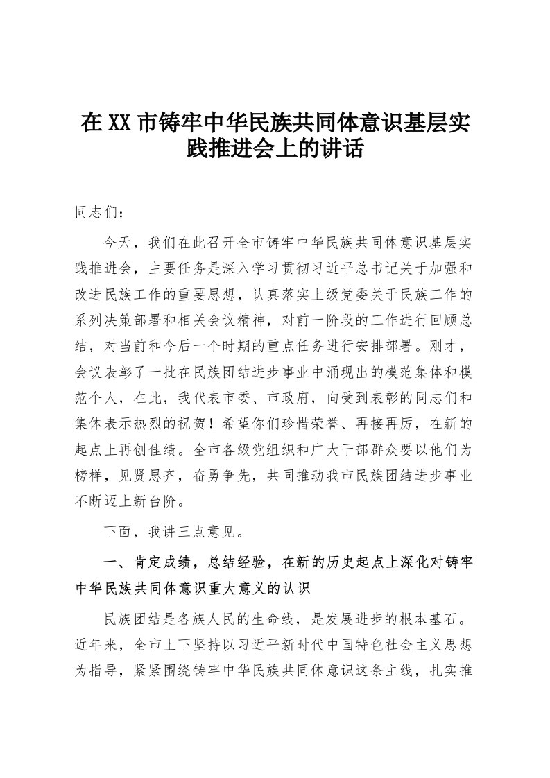 在XX市铸牢中华民族共同体意识基层实践推进会上的讲话