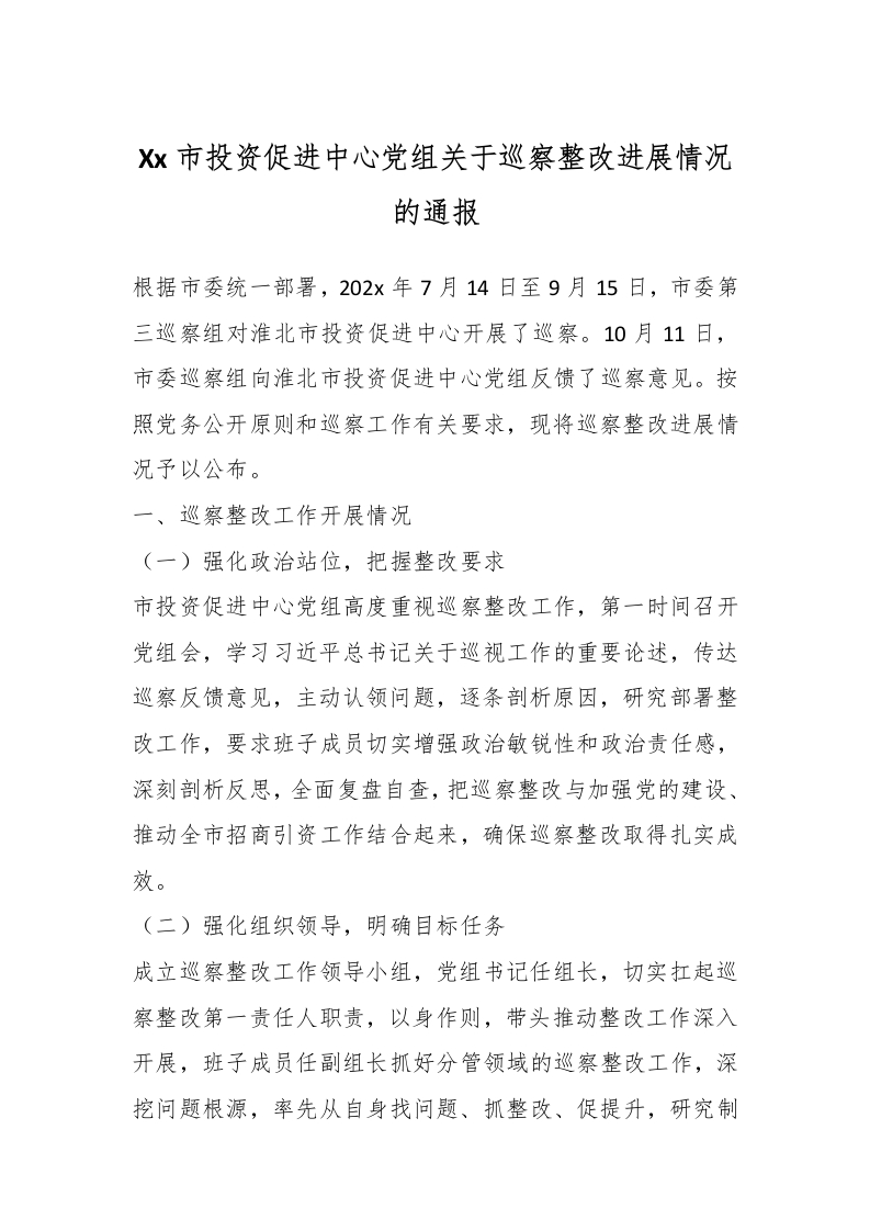 Xx市投资促进中心党组关于巡察整改进展情况的通报_副本