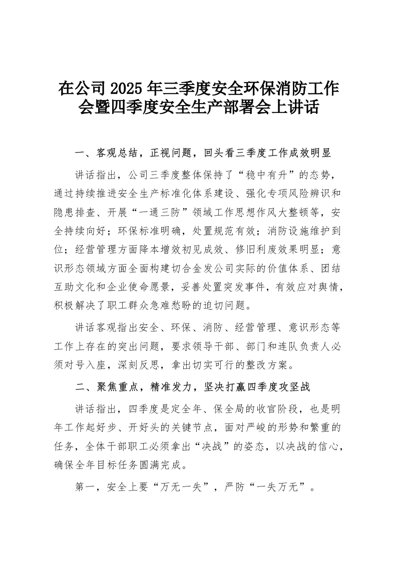 在公司2025年三季度安全环保消防工作会暨四季度安全生产部署会上讲话