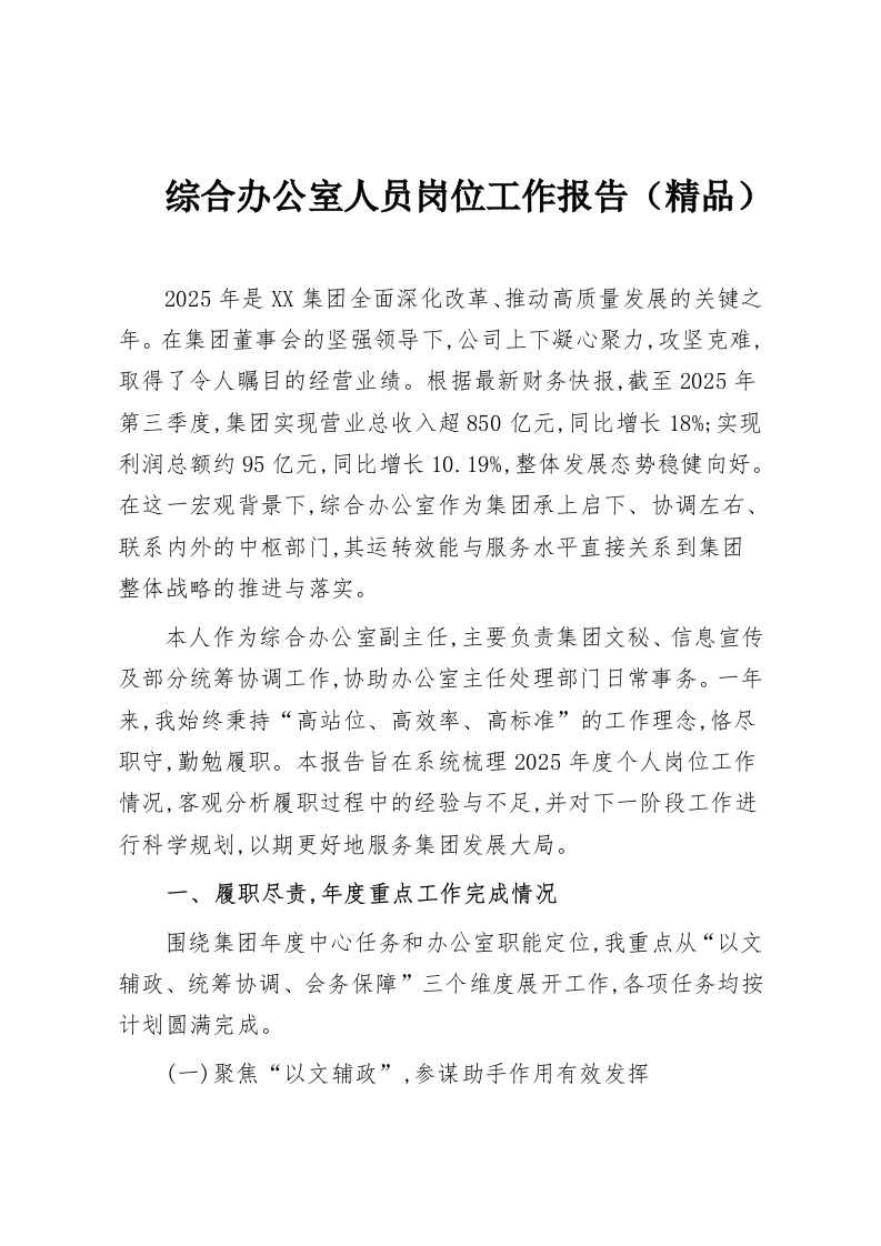 综合办公室人员岗位工作报告(精品)