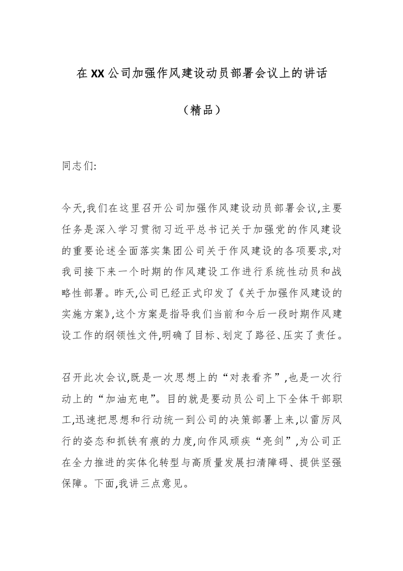 在XX公司加强作风建设动员部署会议上的讲话(精品)_副本