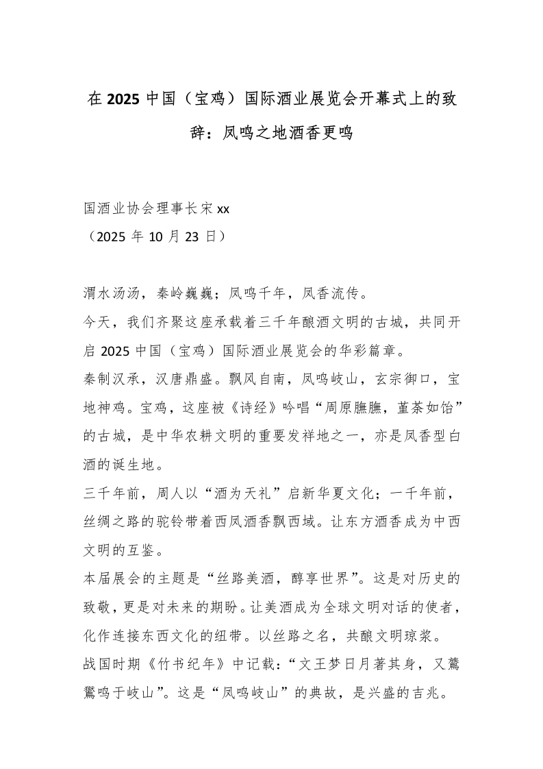 首页工作文档在2025中国(宝鸡)国际酒业展览会开幕式上的致辞:凤鸣之地酒香更鸣_副本