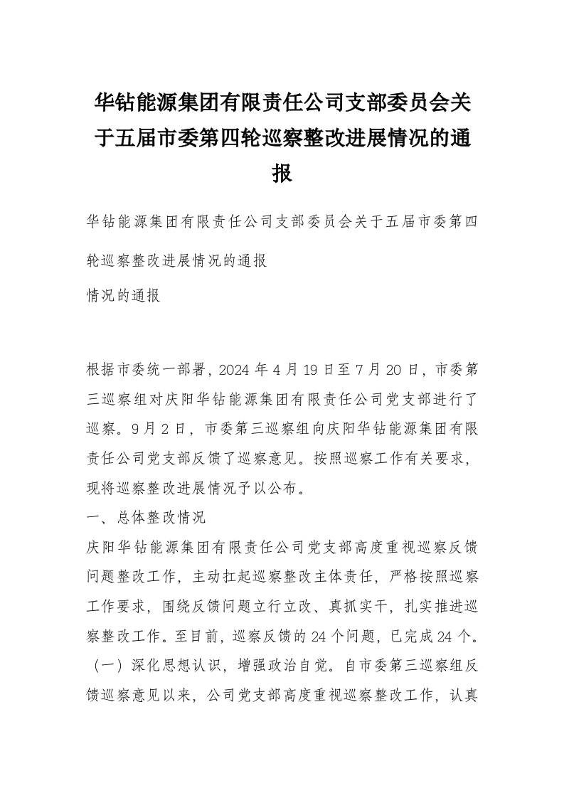 华钻能源集团有限责任公司支部委员会关于五届市委第四轮巡察整改进展情况的通报
