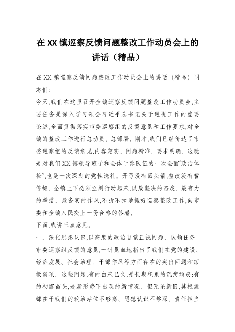 在XX镇巡察反馈问题整改工作动员会上的讲话(精品)
