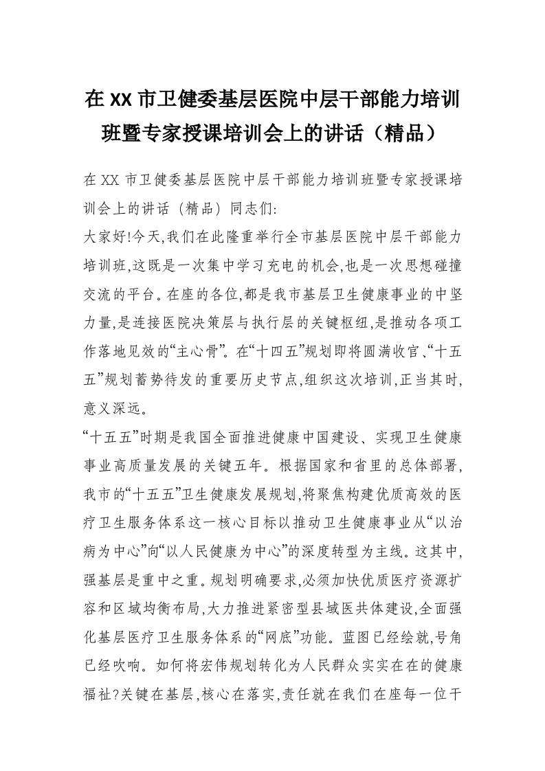 在XX市卫健委基层医院中层干部能力培训班暨专家授课培训会上的讲话(精品)